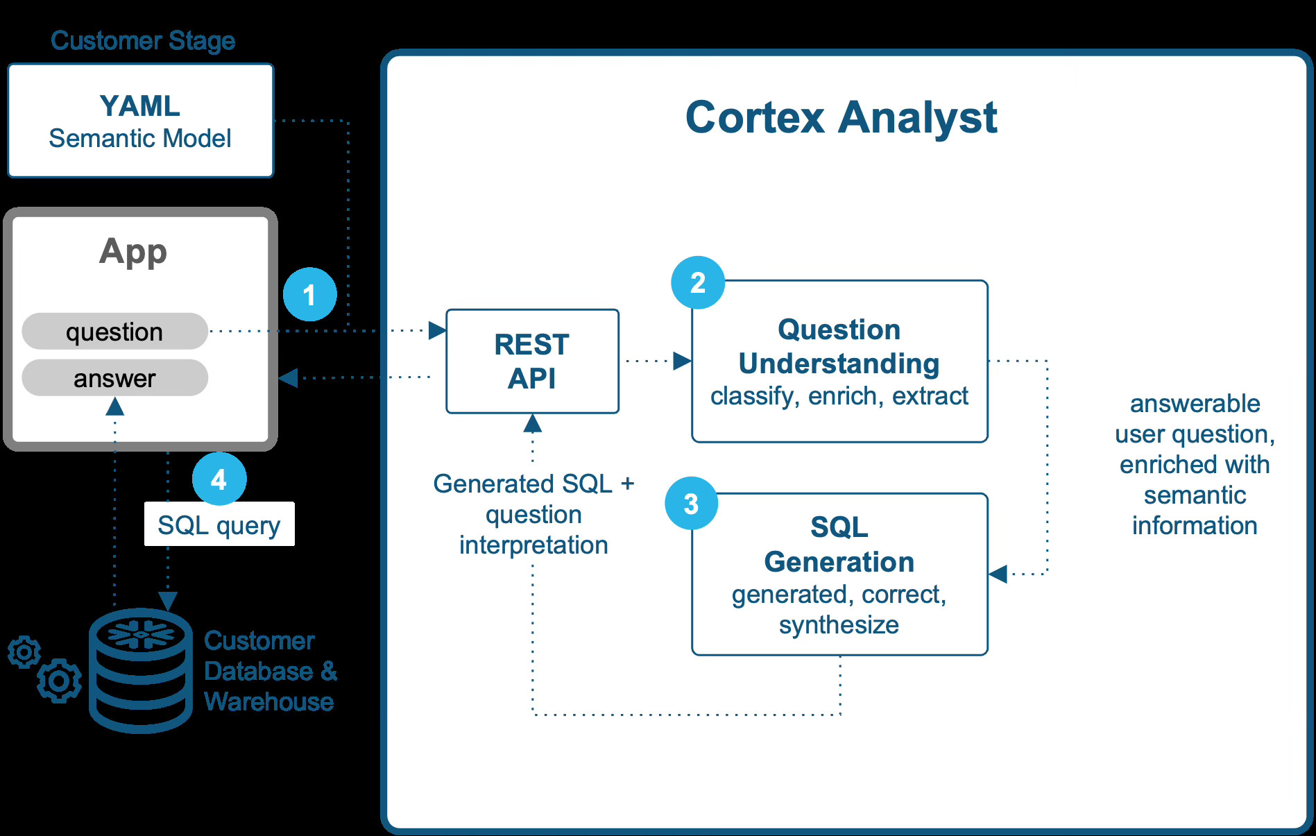 - Request - a client application submits user questions and a Semantic Model YAML to Cortex Analyst REST API.